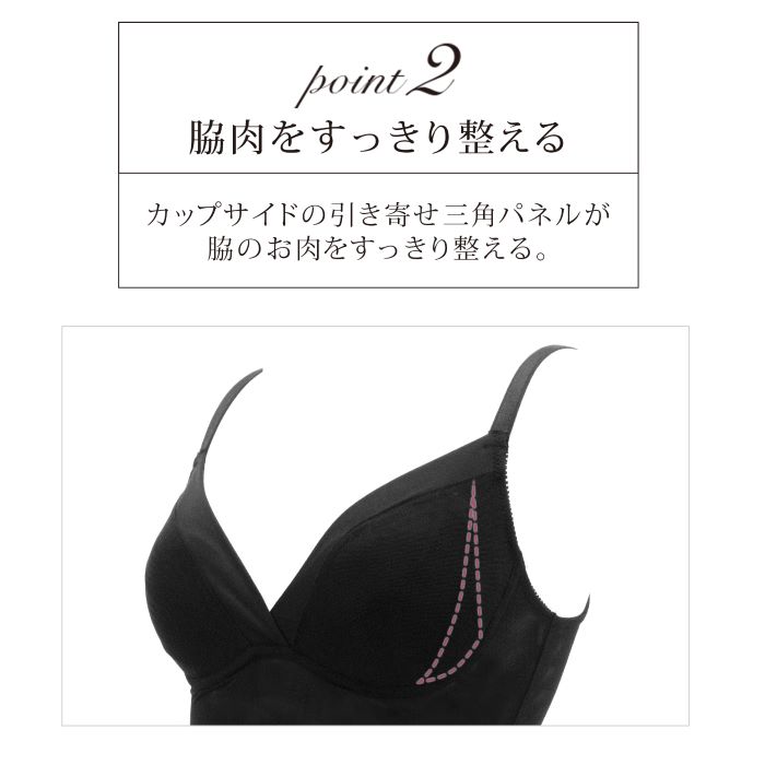 またカップサイドの“引き寄せ三角パネル”が脇のお肉をすっきり整え、カップ中央に“広がり防止パネル”を付けることで胸が横に広がることを防いでくれます。